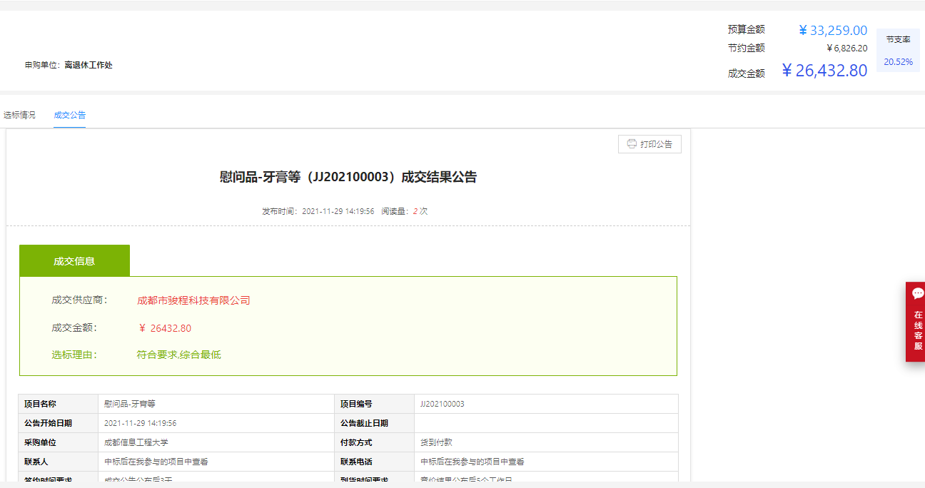 离退处牙膏卷纸等慰问品网上竞价采购结果公告