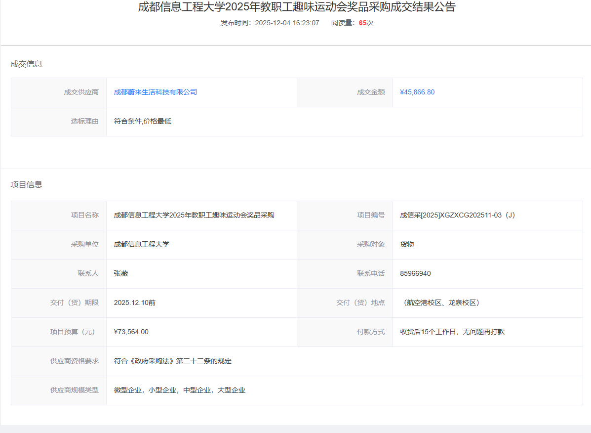 成都信息工程大学2025年教职工趣味运动会奖品采购成交结果公告